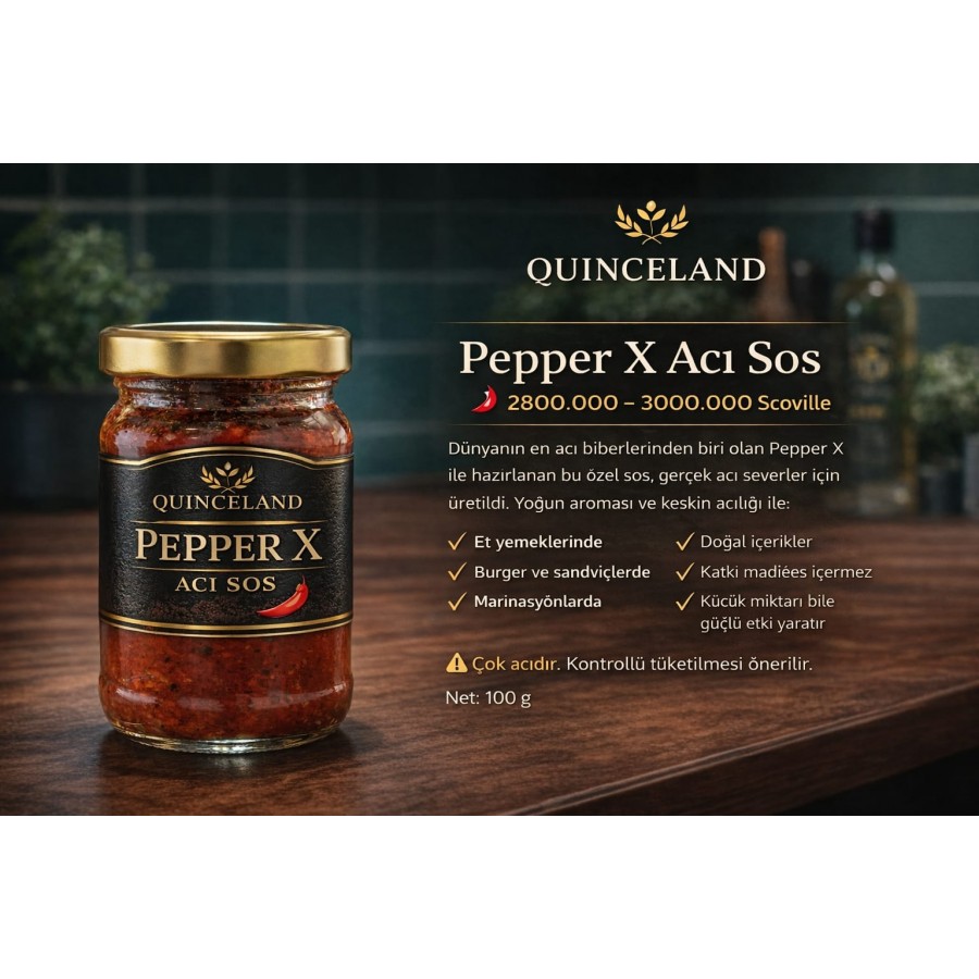 2023 de dünyanın en acı biberi olarak açıklanan pepper X den yapılan bu sos acı severlerin acı eşiğini zorlayacak gibi.bir nohut parçası kadarı tüm tencere yemeğini acı yapabilir.et yemeklerinizde,burgerlerinizde ve marin işlemlerinizde kullanabileceğiniz bir lezzet.çeşitli baharatlar ile zenginleştirilmiş ve quinceland zeytinyağının lezzeti ile son dokunuşları yapılmış mükemmel bir sos.100 gr cam kavanozda